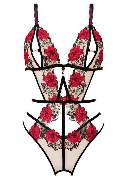 "Our Caged Rose Crotchless Body is made with chic rose embroidery with metallic yarn. Designed with peek-a-boo open cups, it features cut-out details down the centre front and sides and a foldover crotchless gusset for an erotic reveal. The back is complete with swan hook fastenings and an open Brazilian bum with strapping across. Browse for matching hosiery and wear with the matching Cage Rose range for a sultry look.