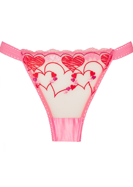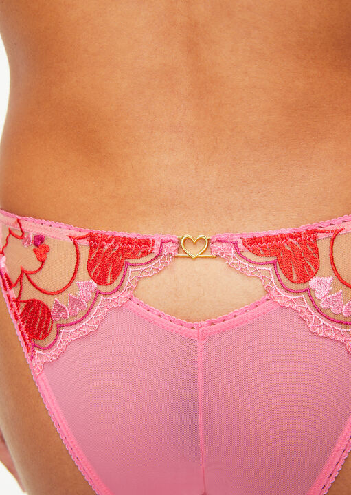 Indulge in romance and set their pulse racing in our Heart Bouquet Brazilian. Made from heart embroidery on a sheer fabric base, it features metallic heart hardware and a Brazilian back with a cut out detail. Wear with the matching Heart Bouquet range for an eye-catching bedroom ensemble.