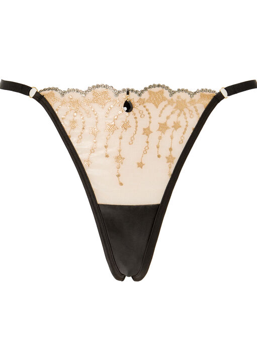 Take their full attention in our Stardom Thong. Made from star embroidery with dazzling holographic foil, it has a scalloped edge at the top and an eye-catching trinket at the centre front. Designed with elastic side straps that lead to the mesh thong-shaped back for a barely there feel. Pair with the complete Stardom range to add to your seduction.