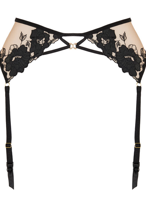 Unleash your inner temptress in our Insatiable Suspender Belt. Combining soft floral embroidery with striking PU, it has strapping details at the front and the back and gold hardware. Complete with adjustable suspender straps and a hook and eye fastening. Style with a pair of stockings and the matching Insatiable collection to leave them wanting more.