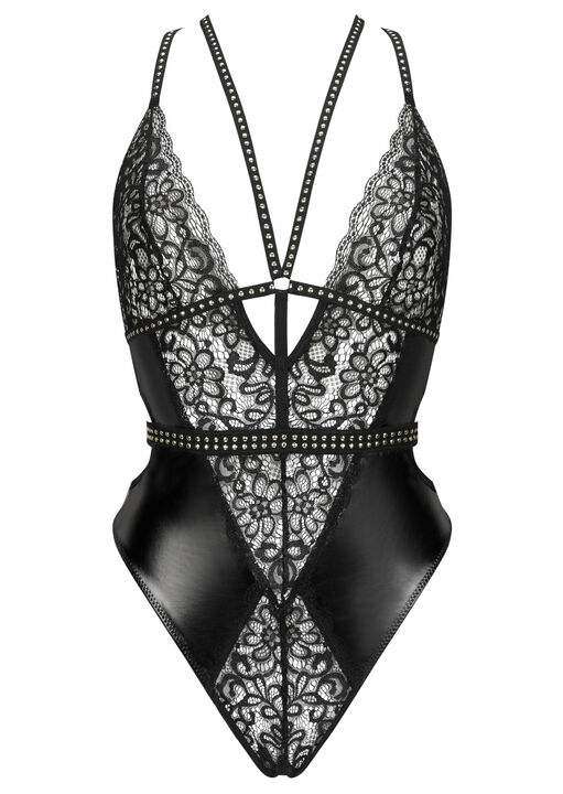 Have all eyes on you in our Obsession Luxe Body. The lace offers a peek of what’s underneath whilst the gold-studded PU adds an edge to your style. With harness-style strapping through the middle, it features daring cut-out detail and a crotchless opening. The back is complete with cross-over straps and a thong-shaped bum. Style yours with a pair of hold-ups for an unforgettable ensemble.