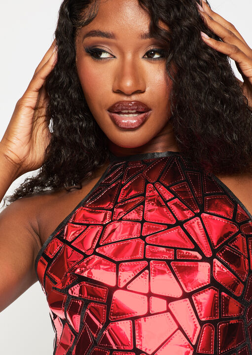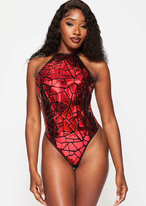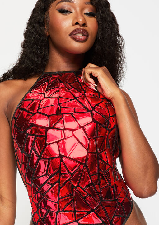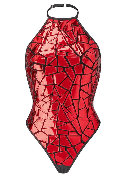 Take centre stage in our Glass Heart Body. Cut to a halter neck shape, it is made from mesh with a velvet base, it features pieces of glossy iridescent vinyl material over the front for an eye-catching, shattered glass effect. The back is low cut whilst the lower half is a thong shape. Team with a pair of PU leggings to make a statement.