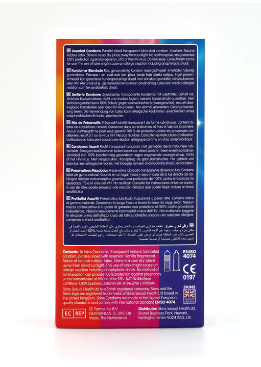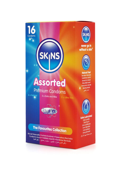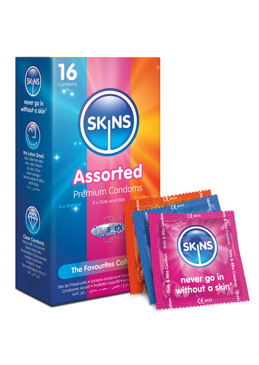 Explore new sensations with our premium condom multi-pack, featuring three exciting styles: Natural, Dots & Ribs, and Ultra-Thin. Whether you’re in the mood for a classic feel, extra stimulation, or heightened sensitivity, this Skins Assorted lets you choose your pleasure every time. Crafted from high-quality natural latex, each condom is rigorously tested to meet the highest safety standards - so you can enjoy worry-free intimacy. Safe, reliable, and designed for pleasure, this is your go-to pack for confident, satisfying experiences.